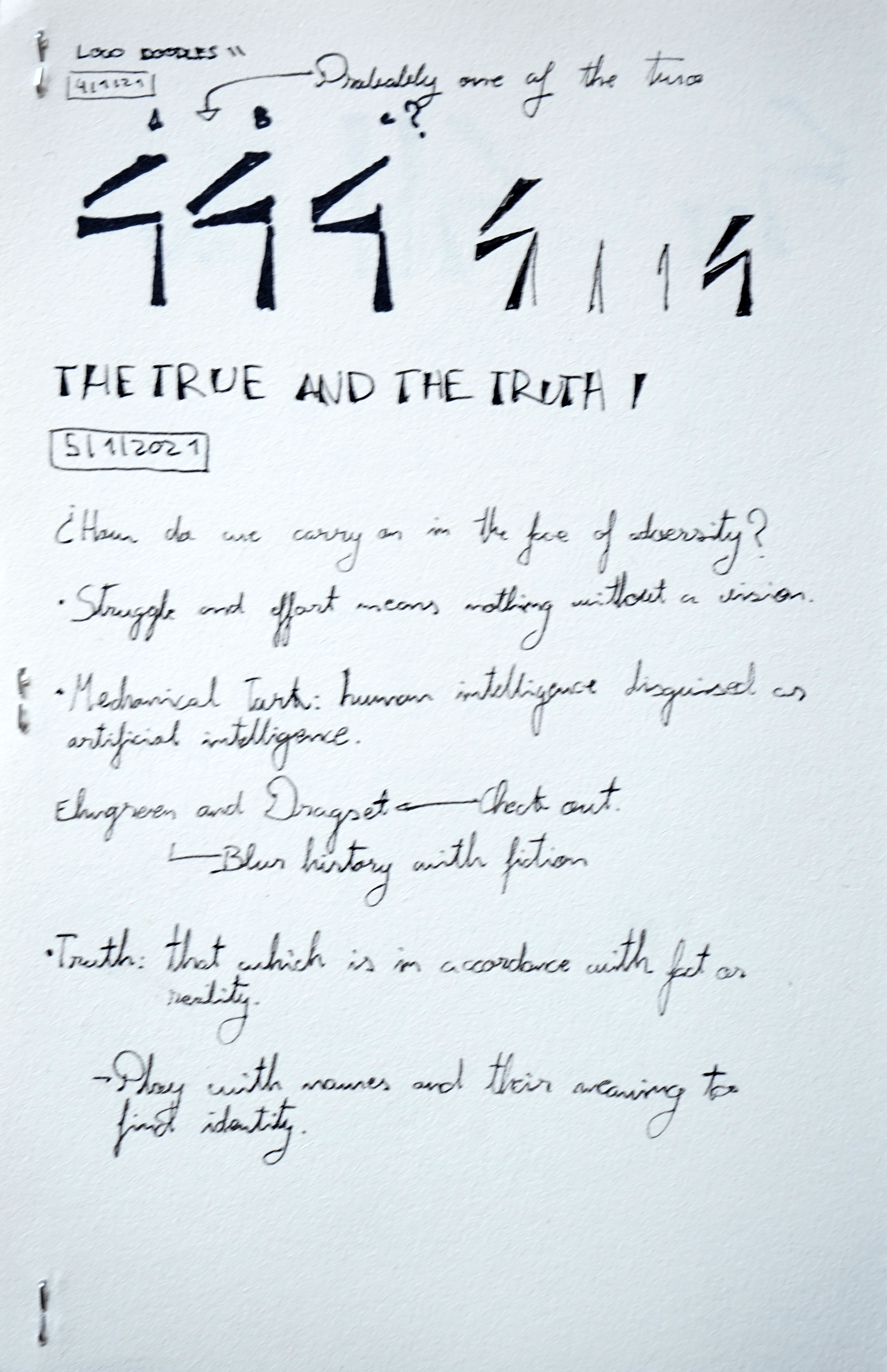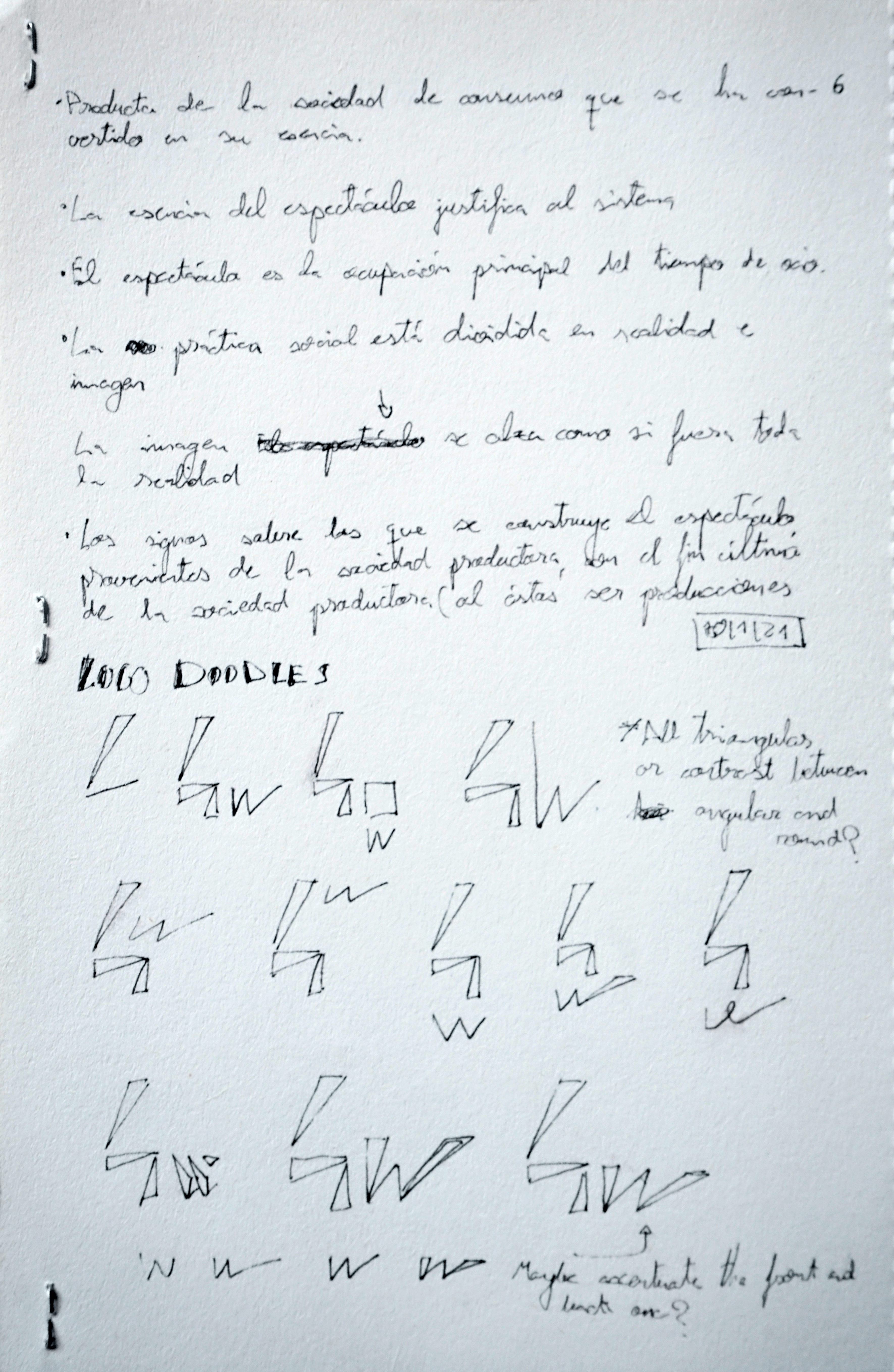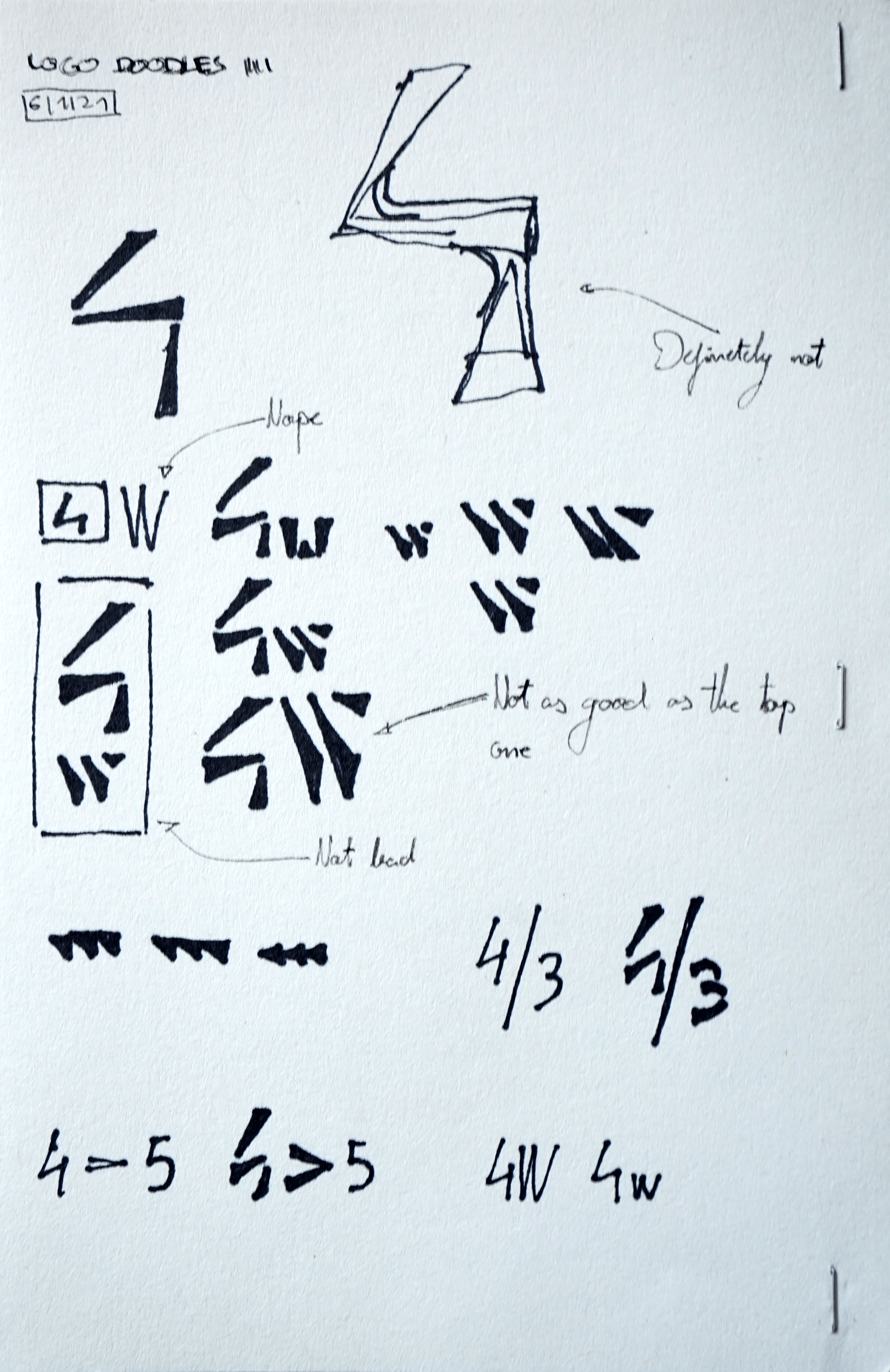 Once finished with all the theory and seeing it was a viable option, I started designing the logo. I was very inspired with the Paula Scher episode of Abstract (a netflix show) and inmediately started drawing, trying to reduce basic shapes to triangles. Specially the number 4. These are some of the sketches and notes i made throught the whole project:
