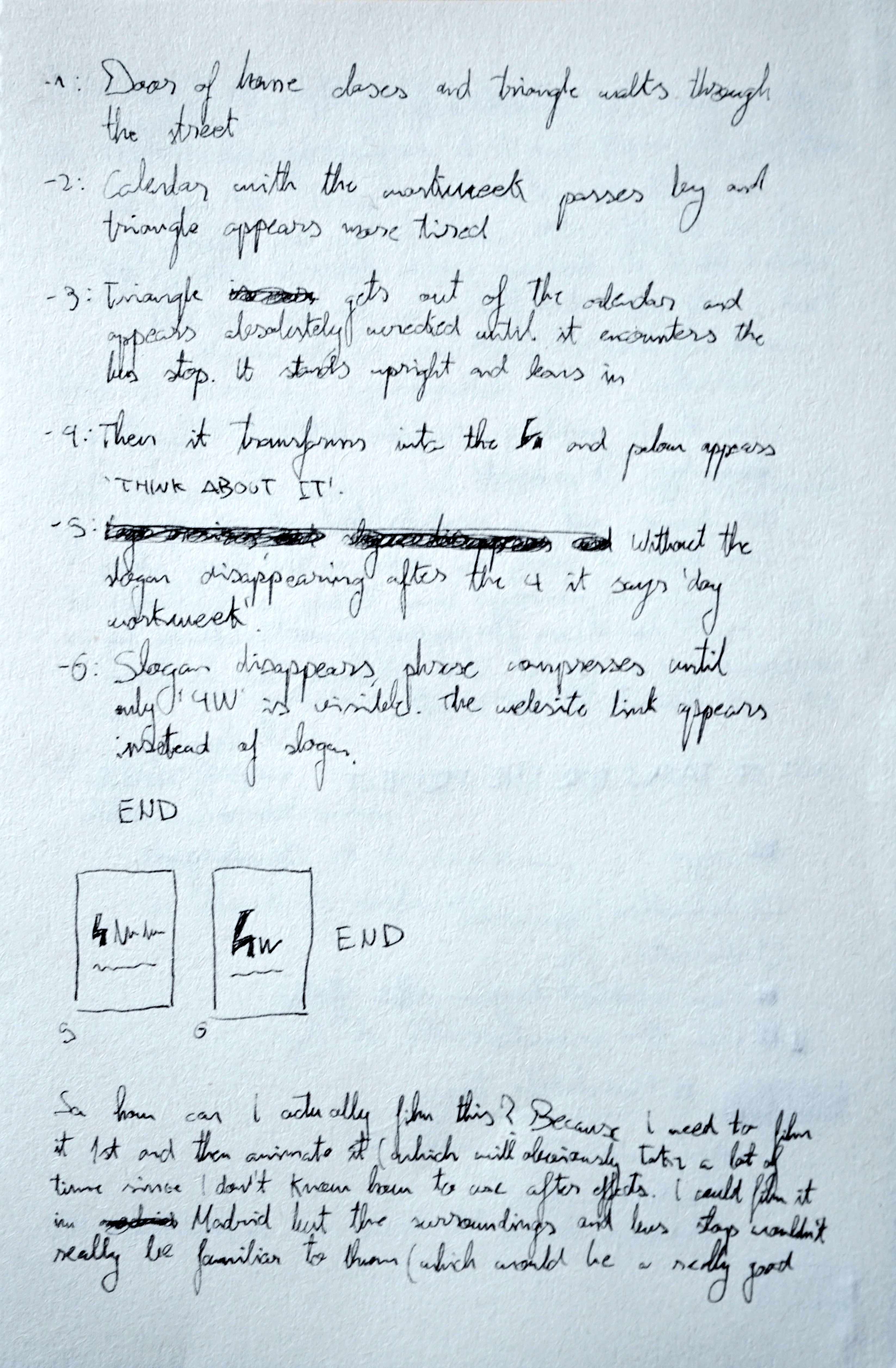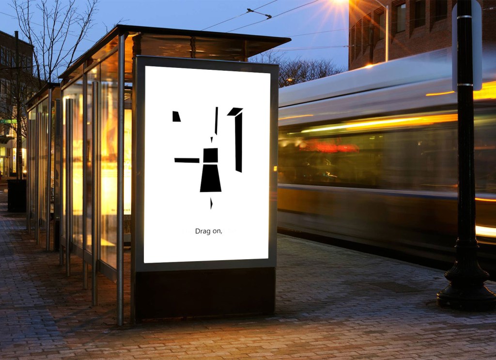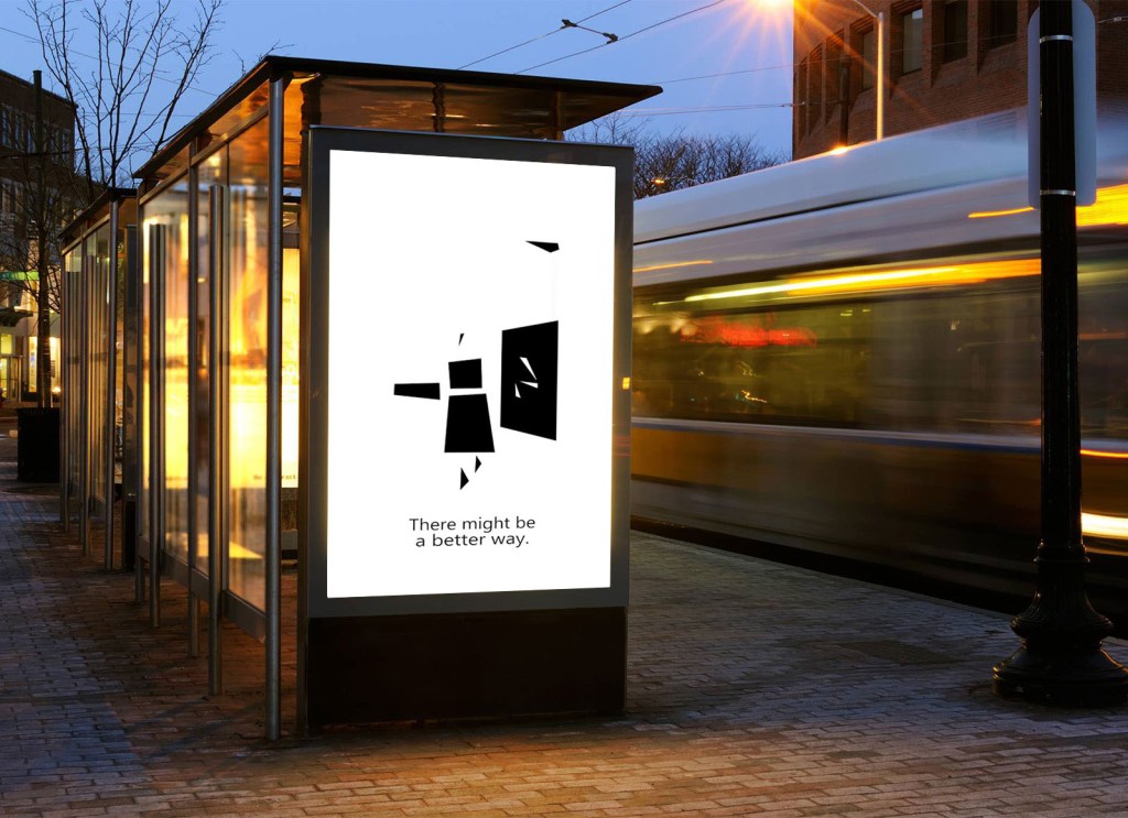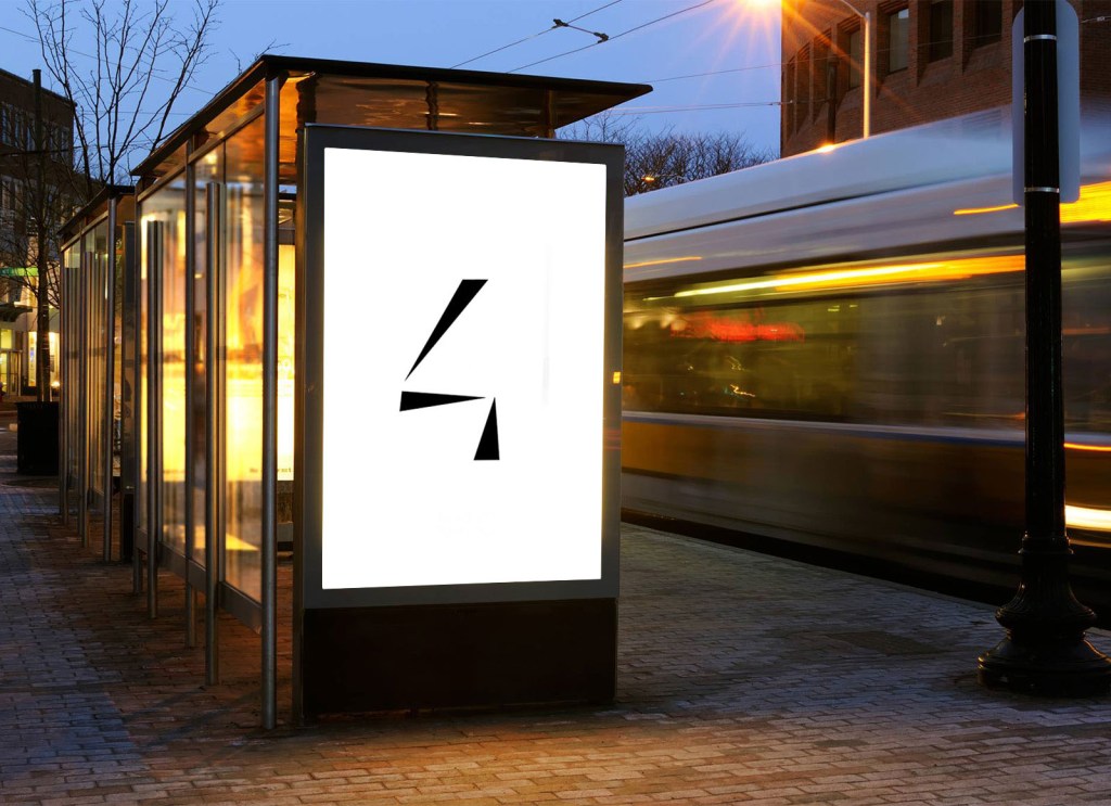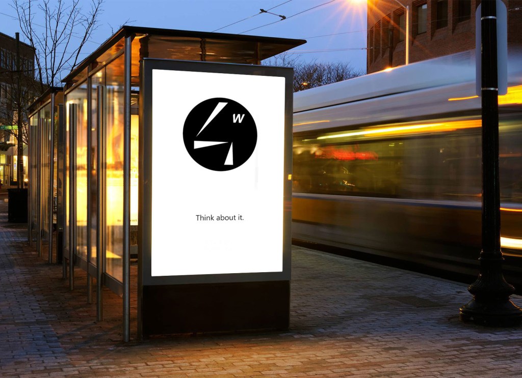 After the first session of feedback for the logo design I was told that the four looked like a person in a sitting position, and that triggered the main idea for this ad. I was going to film a friend walking down the street (using the video as a template for the animation and using triangles to represent the body) and coming up to a bus stop, where that person would look and transform into the four, with the slogan ‘think about it’ below it (observing the simile between the sitting position and rodin’s ‘The Thinker’).