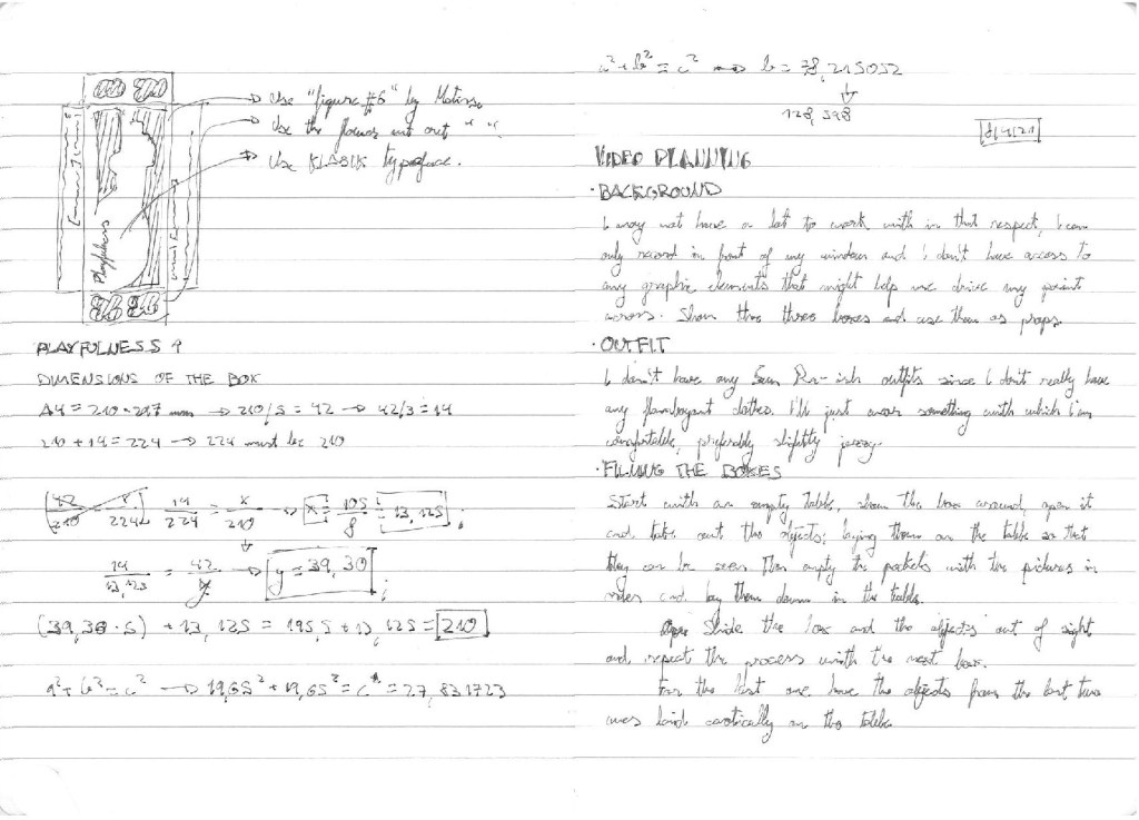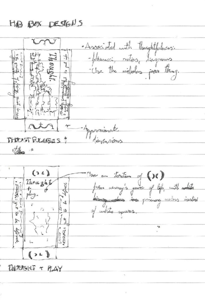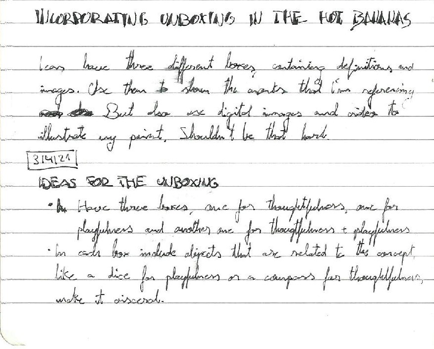 The main aspect of the project with which I was struggling with was the unboxing, I had now clue on how to integrate a box in all of this and even less on what to take out of it. I ended up thinking that since I would have to show a lot of media to get my point across, I would have to make a box for each concept (thoughtfulness, playfulness and thought + play respectively) and fill them with printed images to accompany my talking points.