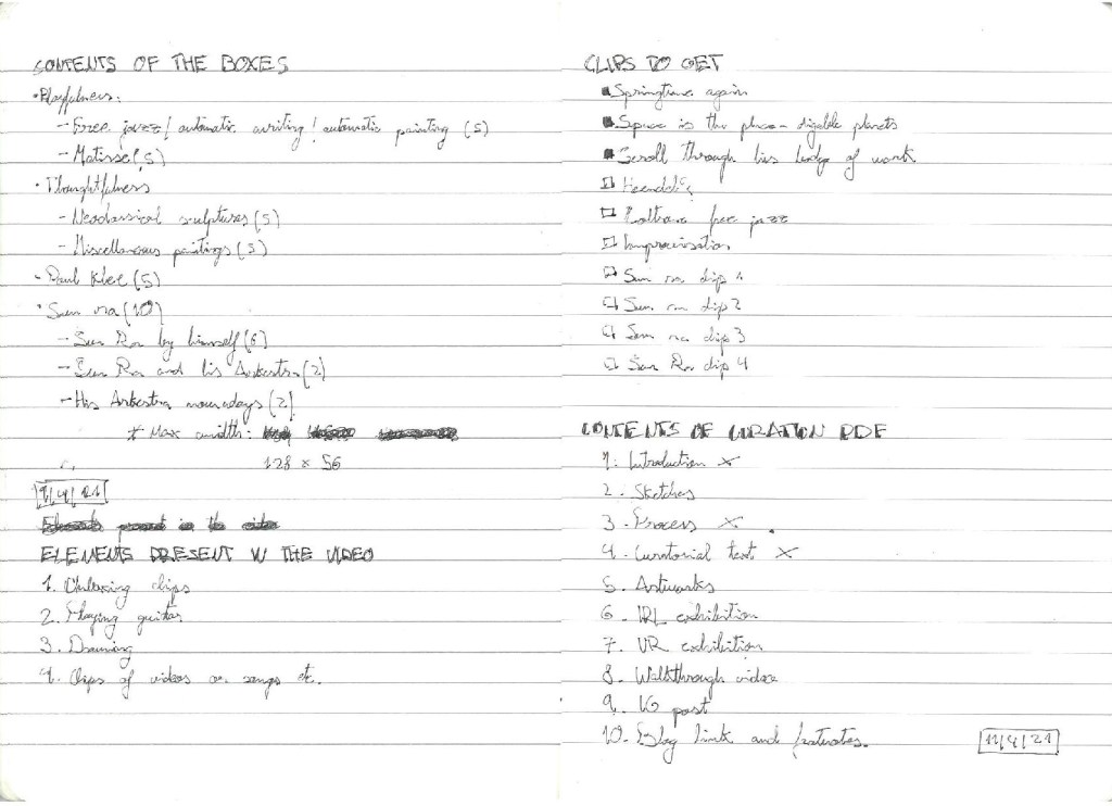 Research-wise, Sun Ra might be one of the hardest people to get a grasp on, as I explained in the video, and I’m very thankful that I already knew about who he was and what he did so that I didn’t have to spend excessive amounts of time in research. However, I did watch his film “Space is the Place”, a couple of documentaries and listend to about eight more records. For the other resources and examples, I drew from what I already knew and had researched (for example,last year I made a full project on Paul Klee, or once I had a two month period where I was obsessed with Velázquez). The knowledge I gained from many H&C lectures proved to be decisive in this stage. I tried to use very varied resources, old and new, to drive my point across. I also saw this opportunity to share some of the art that I liked and had impacted me, like Digable Planets or John Coltrane.
