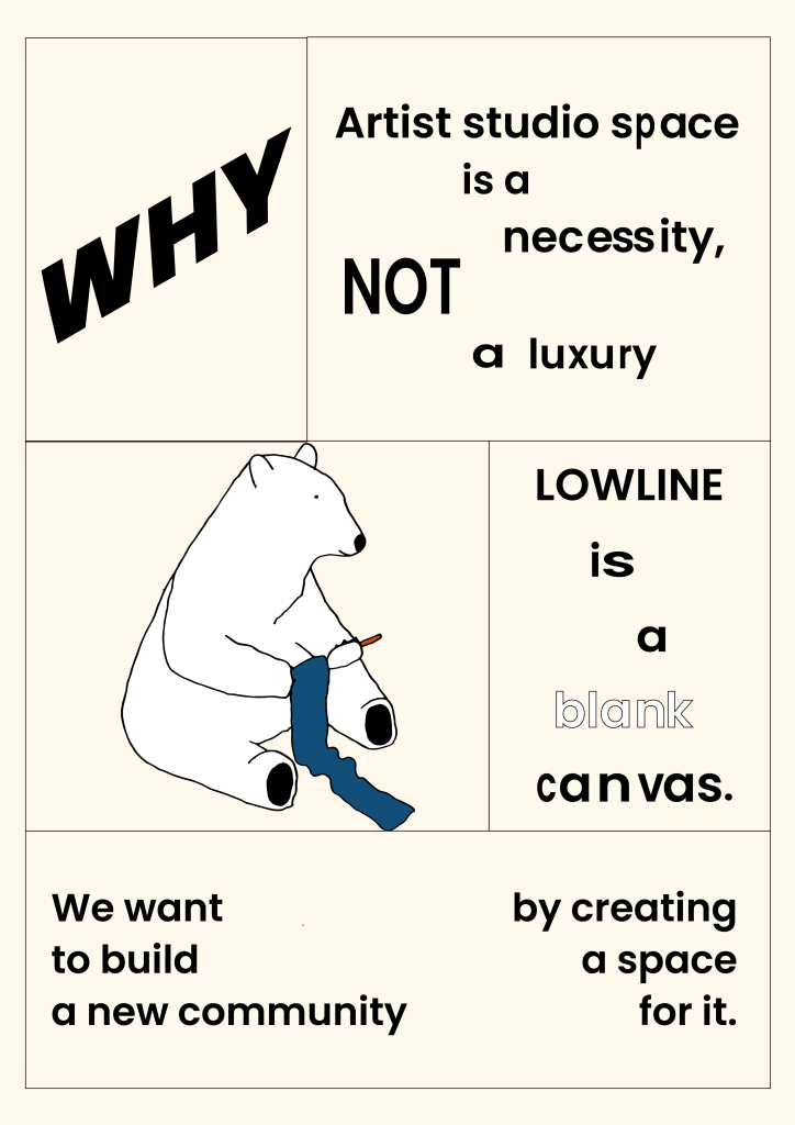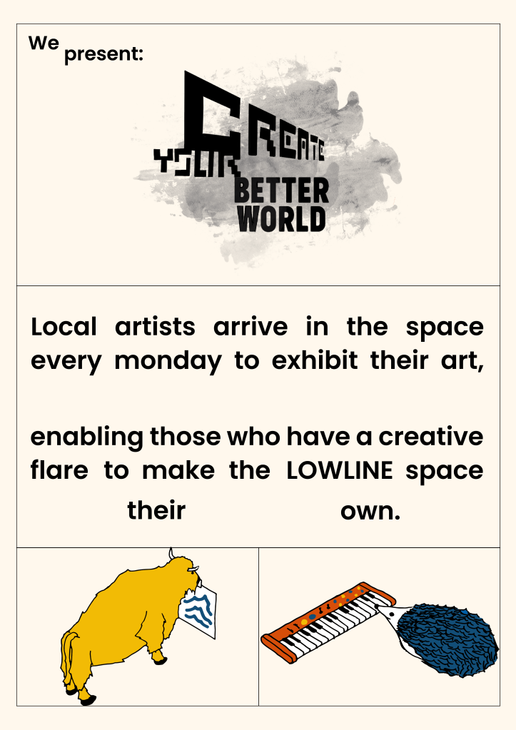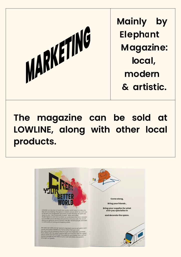 We believed that, aside from having a good idea, having good marketing was key for this to work. As with the products sold at LOWLINE, we decided to go local. We discovered Elephant Magazine, a local photography and art magazine where our idea could be marketed in, in exchange of selling copies of the magazine at the bar. We also found ACME, an organisation that provides studio space to people who can’t afford it. We saw a viable marketing opportunity as well.