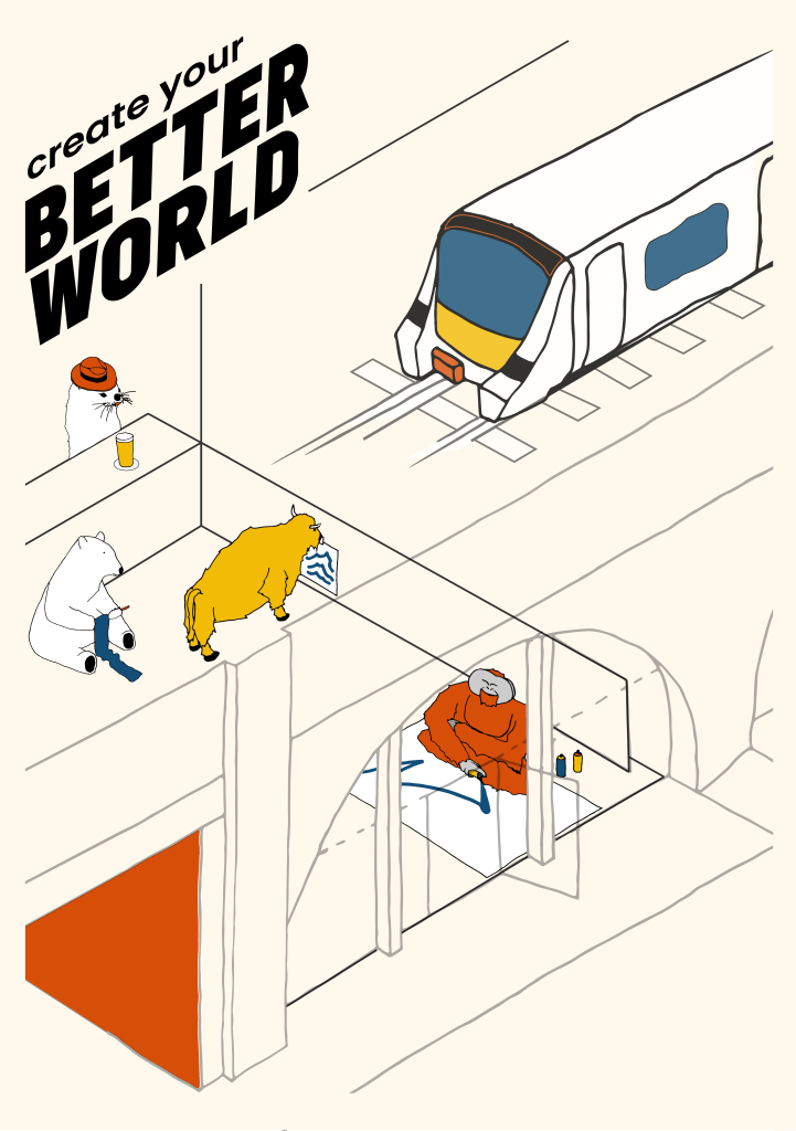 Concerning visuals, I was selected to design the boards. Honestly, I just had fun. I wanted the creators of LOWLINE to see themselves on the boards and feel identified, and thus interested in our idea. Since BETTER WORLD uses animals to give identity to each of their products, I chose to make them characters to have a cartoonish visual representation of the project put in practice. I chose a warm, vintage colour scheme to appeal to LOWLINE’s aesthetic.