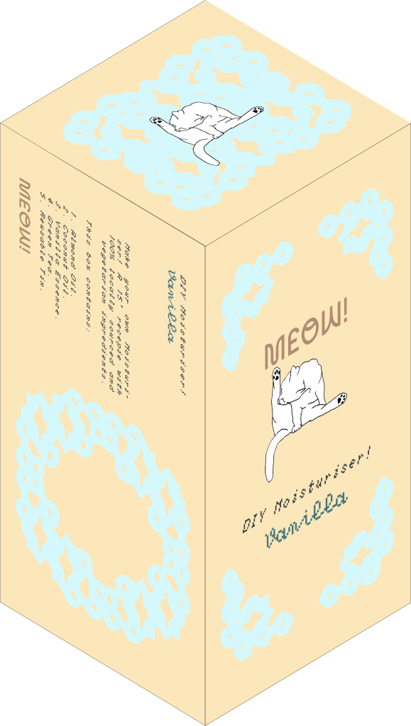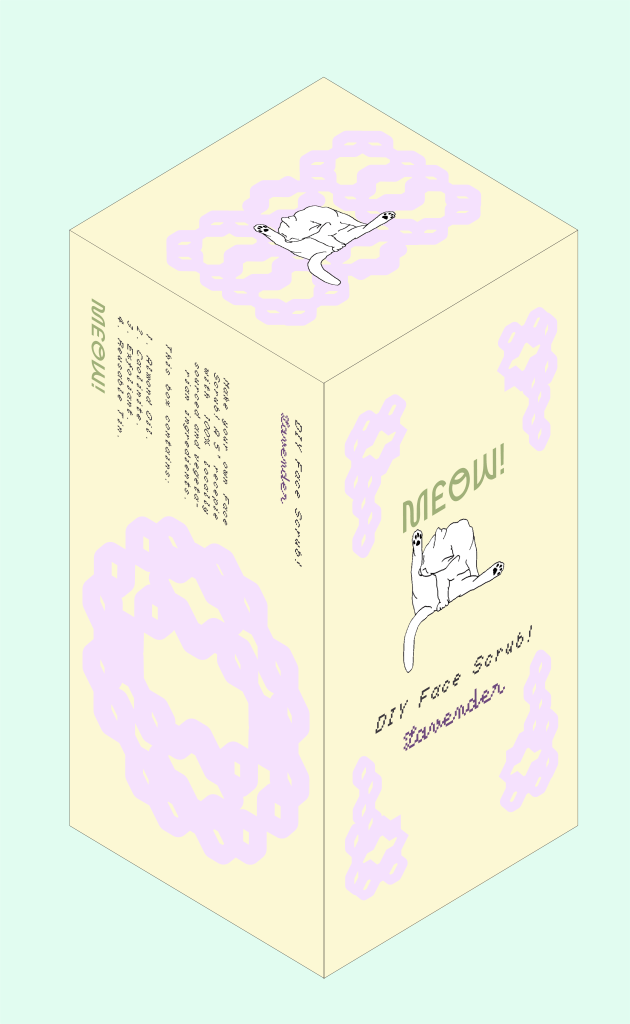 Since I was making this project three days before the final deadline, I didn’t have much time to make mockups. I just made the illusion of a box in illustrator. I made an unique design for each product (lip balm, moisturiser and face scrub) as well as a color scheme for each fragrance (vanilla, lavender and coconut).