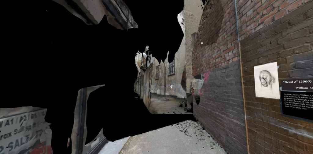 The moment right before the light goes out, the space between shadows and moonlight shimmers on broken glass. This exhibition attempts to capture the liminal spaces surrounding the concepts of Darkness and Death, leaving the scythe behind and embracing the reflection of its victim in it. A view on how artists throughout history and mediums have dealt with and expressed these subjects; from the confrontation of nearby mortality, to the progressive loss of oneself and everything in between. This exhibition will be left on King’s Passage to decay over time but a permanent version is available in VR. Enjoy.